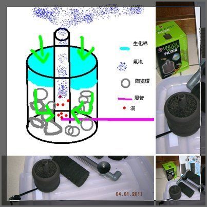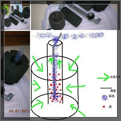 水妖精原理: 從這個圖我們可以看到 水妖精的共同特徵就是有一個塑膠管,打氣機風管接到水妖精的塑膠管內 經由打氣的作用,氣泡會帶著水流往上走,因為塑膠管下面有開洞,所以水流會從四面八方,通過生化綿湧入水妖精,然後跟著氣泡往上跑,如此不停循環